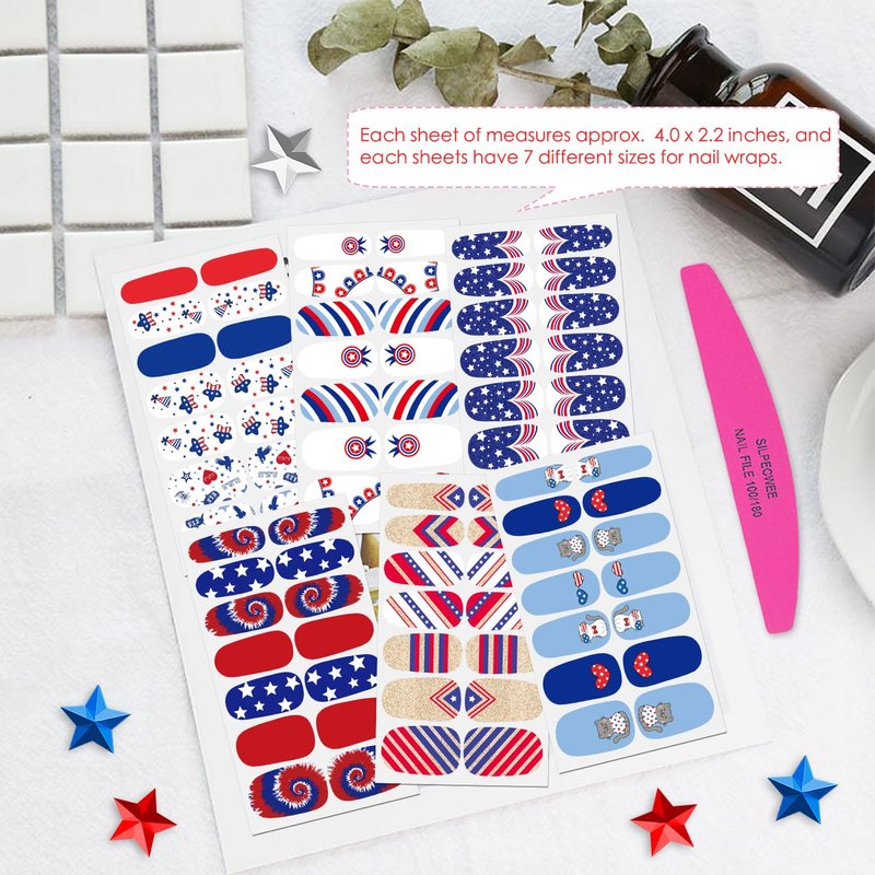 - Package Content - 6 sheets 4th of July nail strips + 1pc nail file. each sheet of measures approx. 10 x 5.5 cm/ 4 x 2.2 inches, total 84 pieces and 7 different sizes, a variety of styles and color, let you always keep gorgeous nails.