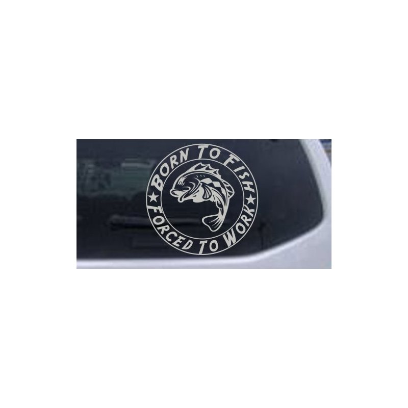 Silver 3in X 3in -- Born To Fish Forced To Work Hunting And Fishing Car Window Wall Laptop Decal Sticker When making your color choice please be aware that our decals do not have a background or background color at all. These are decals not stickers. . When applied all you will see is the outline as shown in the images. If the decal will be going on glass you will want to use a bright color like white, yellow or pink. Black and other dark colors will not show up well on glass. Our decals are die cut from solid 2.8mil vinyl. The vinyl is rated at 5yrs outdoors. Our decals can withstand cold, hot and wet weather with no problem. If you are using the decal inside they will pretty much last as long as you want them. The decals can be removed from any surface but cannot be reused once removed. If applied to a painted surface such as a wall or auto body the paint may come off with the decal when removing it. Our decals can be applied to any smooth flat surface including car, truck, van and suv windows. Our decals can also be used on the body or hoods of automobiles like sports cars, race cars and trucks. You can even use our decals on your motor home or camper. Our decals can also be used for wall art. You can apply any of our decals to the walls in your home, office or garage to add whimsical art. You can also use our decals to personalize your laptop or books. Our decals make great laptop skins. Other places you could use our decals include - horse trailers, kayaks, boats, vans, motorcycles, ATVs, snowboards, snowmobiles, surfboards, RVs, helmets, glass doors, gun cabinets, mirrors, walls, mailboxes, picture frames, tool boxes, painted wood, aluminum, plastics, fiberglass etc...