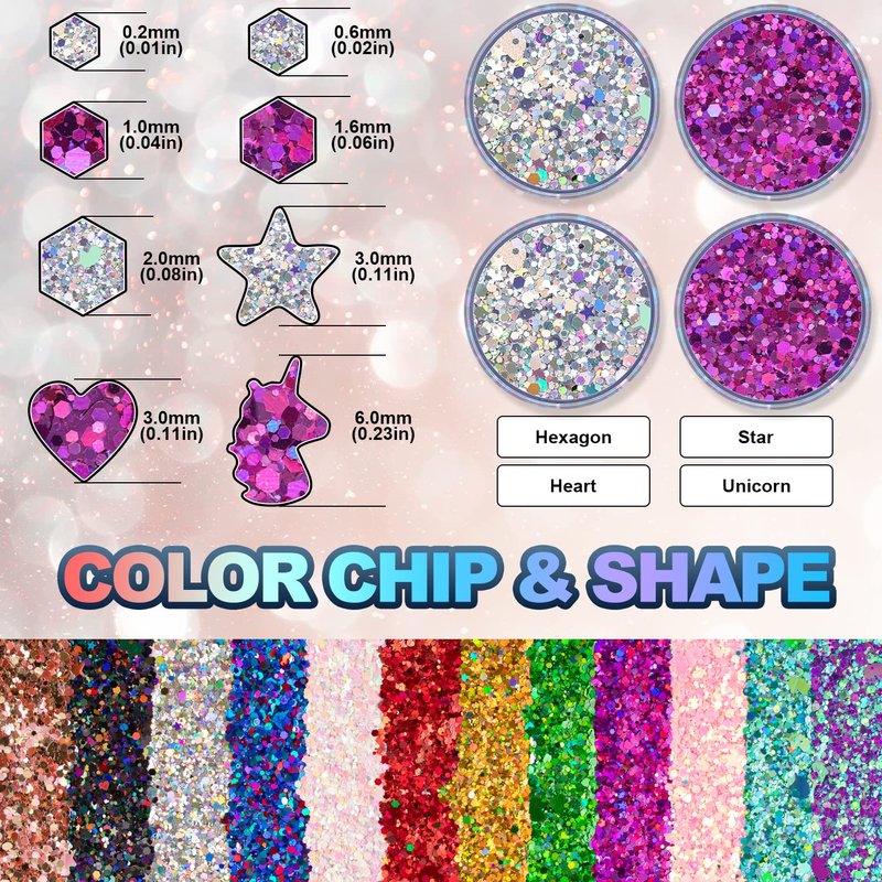 - Holographic Chunky Glitter:the glitters consist of HEXAGON; STAR; HEART and UNICORN. 8 boxes sizes are 0.2mm & 0.6mm & 1mm & 1.6mm & 2mm &3mm & 6mm mixed which perfect for body& Face& Hair make up& nail arts decoration