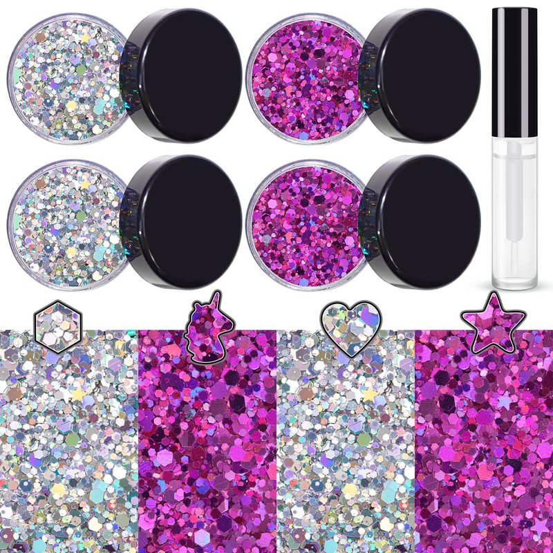- You Will Receive: 4 pots of cosmetic glitter with 8g/0.28oz, quite enough for mutiple times deco, also, free 5ml quick dry glitter glue gel is included
