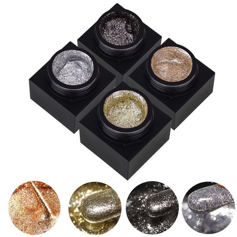 Silver Metal Glitter Gel Nail Polish 4 Colors Painted Metal Platinum Drawing Gel Polish Gold Silver Black Glitter Nail Polish Liner Sparkling Soak Off Gel for DIY Painting Nail Art Gel