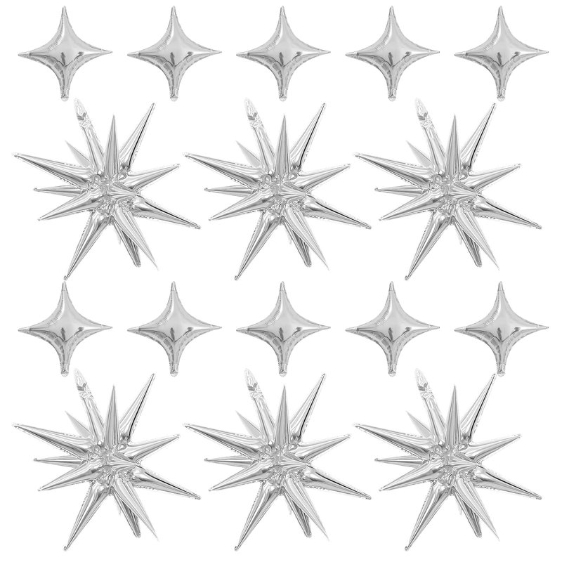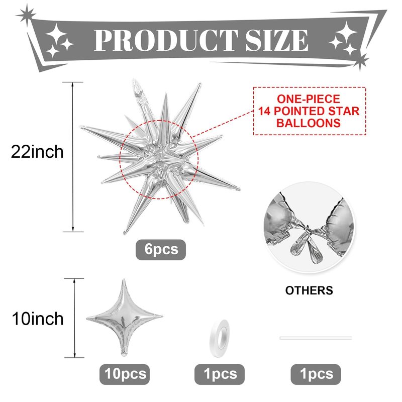 - Silver Star Balloons Set:Package include 6pcs 22Inch silver explosion star balloons,10pcs 10Inch silver four pointd star balloons.Large enough to help you better decorate your party.
