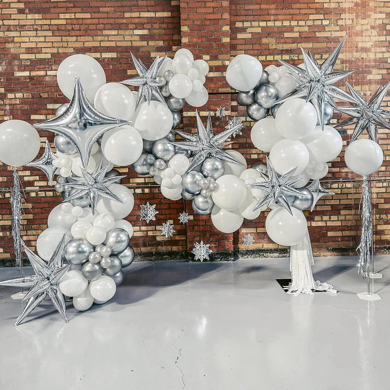 Quantity:6pcs silver starburst balloons,10pcs silver four pointed star balloons
