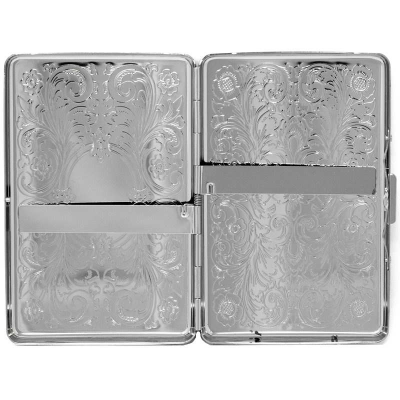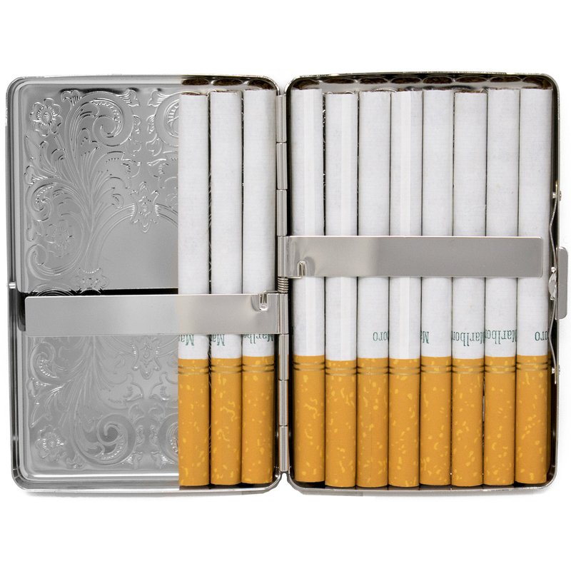 - Gunmetal-plated metallic cigarette case that features an etched pattern on the front. Measuring 4" X 2.5", this case is compact and can accommodate 16 individual cigarettes including 100s (100mm), King (84mm) and Regular (70mm) Size cigarettes.