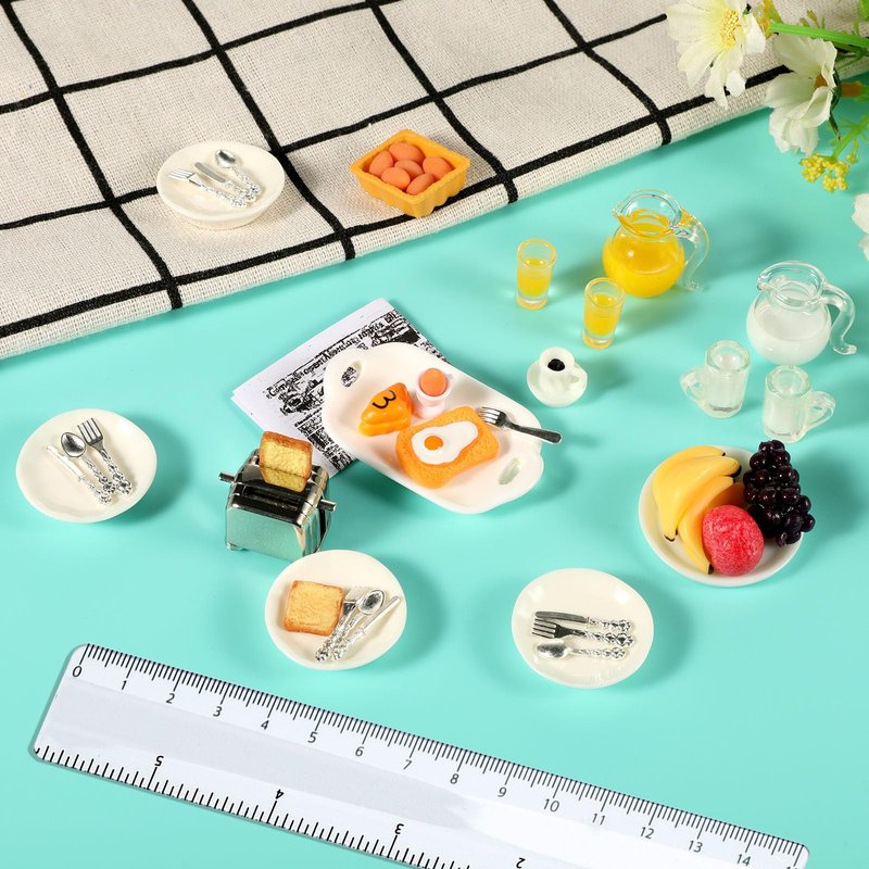 simarro Miniature Dollhouse Breakfast Accessories, 46 Pcs 1:12 Scale Mini Toast Machine Bread Milk Eggs Cups Fruits Plates Fork Spoons Drink for Dollhouse Kitchen Scene and Cake Topper Decor