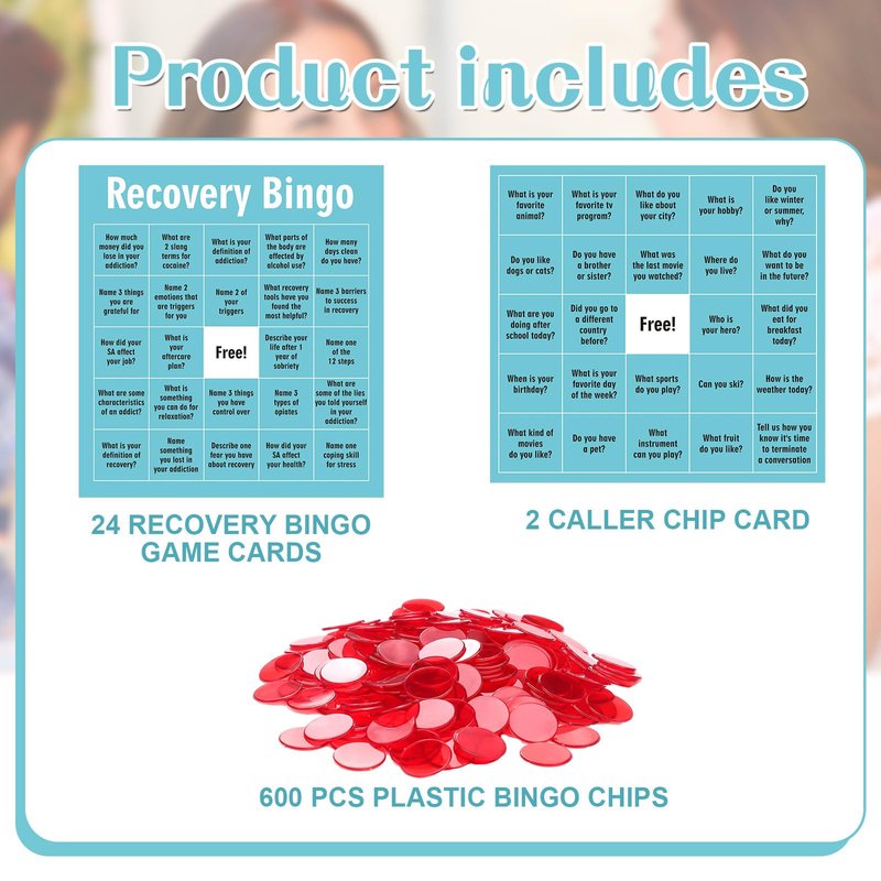 - Comprehensive Package for Effortless Gaming: the recovery bingo game comes as a complete package of 24 recovery bingo cards, 2 calling cards, and 600 cross clips, no need to purchase anything separately; Your group therapy, family event, or class get-together is ready to roll with a single purchase; It's all about convenience and value for money