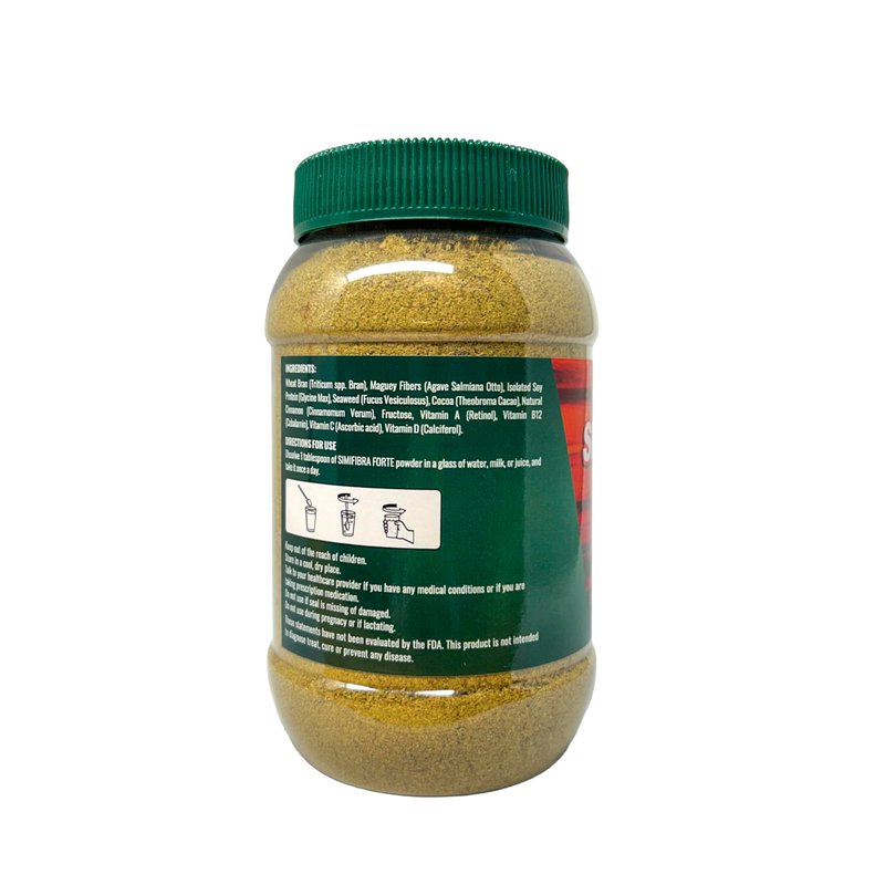 Simifibra Forte es un suplemento de fibra dietética premium en una práctica presentación en polvo, especialmente formulado para apoyar la salud digestiva y ayudar en el control de peso. Su mezcla rica en fibra promueve evacuaciones regulares, favorece un microbioma intestinal equilibrado y ayuda a proporcionar una sensación de saciedad prolongada, lo que facilita evitar el consumo excesivo de alimentos y mantener hábitos saludables. Perfecto para el uso diario, este envase de 300g ofrece una forma sencilla y natural de aumentar tu consumo de fibra. Solo mézclalo con agua, jugo o tu bebida favorita para incorporar rápidamente un suplemento efectivo a tu rutina de bienestar. Aviso de la FDA: Estas declaraciones no han sido evaluadas por la Administración de Alimentos y Medicamentos (FDA). Este producto no está destinado a diagnosticar, tratar, curar ni prevenir ninguna enfermedad.
