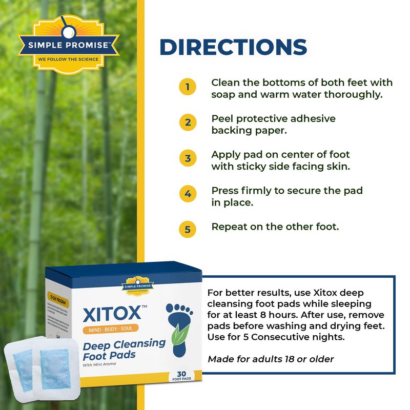 - Suggested Use for Deep Cleansing Pads: Clean the bottoms of both feet with soap and warm water. Apply pad on the center of foot with sticky side facing the skin. Press firmly to secure in place. Repeat on other foot. For best results, use Xitox deep cleansing foot pads while sleeping for at least 8 hours. After use, remove pads and wash and dry feet, then see how they can rejuvenate your body and get you more restful sleep!