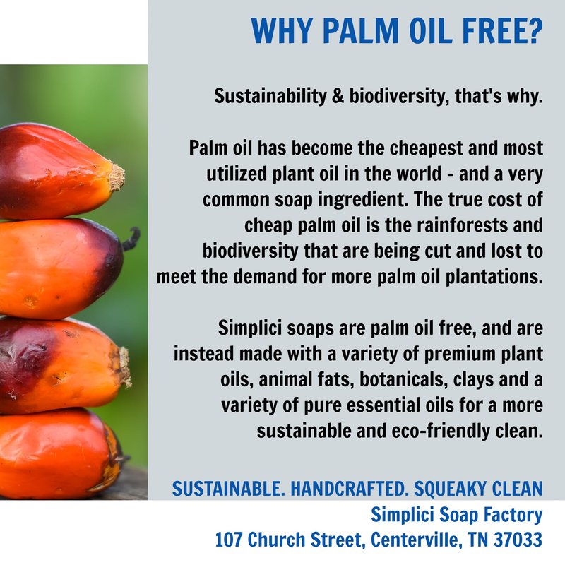 Simplici Soap Factory produces artisan-crafted and conscientiously packaged bar soaps from sustainable ingredients (no palm oil, always palm oil free).