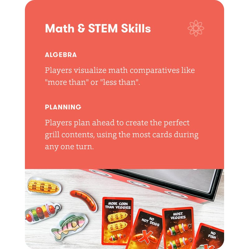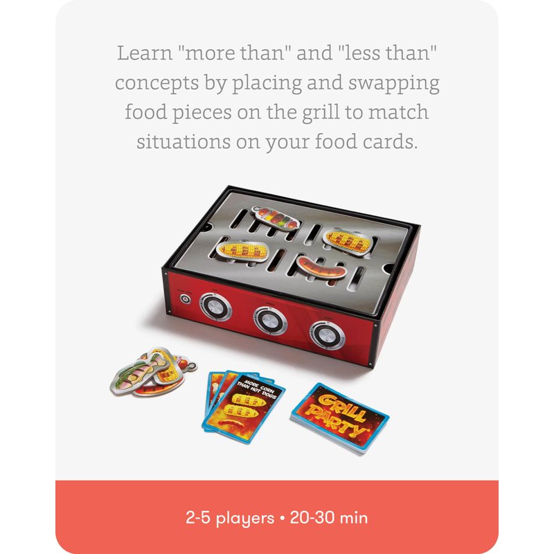 - PRACTICE MATH COMPARATIVES: Grill Party is a great way to help kids visualize math comparatives like more x than y, most of x, or none of y. Learn to plan ahead by creating the perfect grill contents to use most of your cards during any one turn.