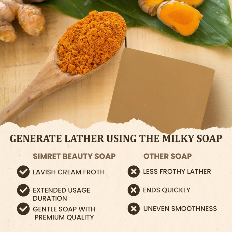 Simret Beauty Turmeric Soap Bar: Your Ultimate Solution for Clear, Smooth, and Radiant Skin Transform your skincare routine with the Simret Beauty Turmeric Soap Bar, a premium blend of nature’s finest ingredients designed for face and body cleansing. This Organic Turmeric Soap combines the potent benefits of Turmeric Root Powder and Charcoal to deliver a comprehensive solution for acne, dark spots, and uneven skin tone, making it a top choice for those seeking a Dark Spot Remover Soap. Why Choose Simret Beauty? Natural & Organic Ingredients: Our soap is enriched with Shea Butter, Coconut Oil, Olive Oil, Castor Oil, Sandalwood Oil, Lavender Oil, and Rosewood Oil, providing a nourishing experience that is gentle yet effective. Powerful Skin Benefits: The Turmeric and Charcoal Soap deeply cleanses to detoxify your skin while promoting a brighter complexion. It’s a perfect Antioxidant Soap and Anti-Inflammatory Soap for those who want a radiant glow. Suitable for All Skin Types: Whether you have oily, sensitive, or combination skin, this Unisex Soap Bar is crafted to be gentle and effective, making it ideal as a Daily Use Soap for the whole family. Safe & Ethical: Enjoy a Cruelty-Free Soap that is also Gluten-Free, Sulfate-Free, Chemical-Free, and Eco-Friendly. This Natural and Organic Soap ensures the safety and health of your skin while caring for the environment. How to Use: Wet the bar and your skin thoroughly. Lather the soap in your hands or on a washcloth. Gently massage onto your face and body, focusing on areas with acne or dark spots. Rinse thoroughly with warm water and pat dry. Ingredients: Olea Europaea (Olive) Oil Cocos Nucifera (Coconut) Oil Elaeis Guineensis (Palm) Kernel Oil Water/Aqua/Eau Sodium Hydroxide Ricinus Communis (Castor) Seed Oil Goat Milk Lavendula Angustifolia (Lavender) Flower Oil Cymbopogon Flexuosus Herb Oil Santalum Album (Sandalwood) Oil Aniba Rosaeodora (Rosewood) Oil Butyrospermum Parkii (Shea) Butter Curcuma Longa (Turmeric) Root Powder Charcoal Powder Q&A Session: Q: Is this soap suitable for daily use? A: Yes, the gentle formulation makes it perfect for daily cleansing of both the face and body. Q: Can this soap help with acne and dark spots? A: Absolutely! The turmeric and charcoal in the soap help reduce acne and dark spots, promoting a clearer complexion. Q: Is this product vegan? A: While our soap contains natural ingredients, it includes goat milk, so it is not vegan. However, it is cruelty-free. Q: Does it contain any harmful chemicals? A: No, our soap is free from sulfates, parabens, and other harmful chemicals, ensuring a safe and natural skincare experience. Q: Is this soap bar eco-friendly? A: Yes, our commitment to sustainability includes using eco-friendly ingredients and practices in our soap formulation.