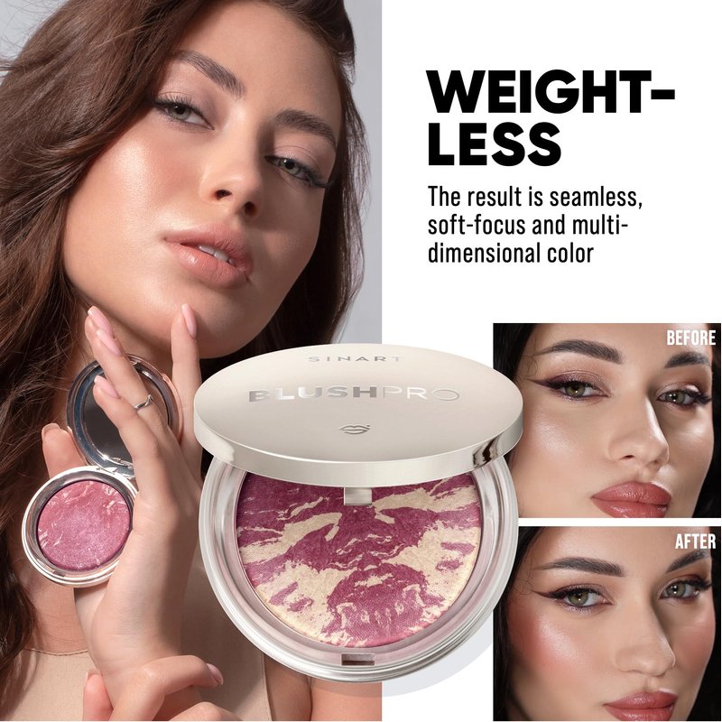 Introducing the BLUSHPRO Face Blossom Baked Blush from SINART - a luxurious powder blush that adds a natural, radiant glow to your complexion. This finely milled, mineral-based formula glides effortlessly onto the skin, blending seamlessly for a soft, velvety finish. The warm, flattering shade enhances your features with a subtle flush of color, sculpting and contouring for a beautifully defined look. Lightweight and long-lasting, this blush delivers buildable coverage that stays vibrant throughout the day. Housed in a sleek, compact case, it's the perfect addition to your makeup routine for a touch of effortless beauty. Achieve a healthy, luminous glow with the BLUSHPRO Face Blossom Baked Blush.