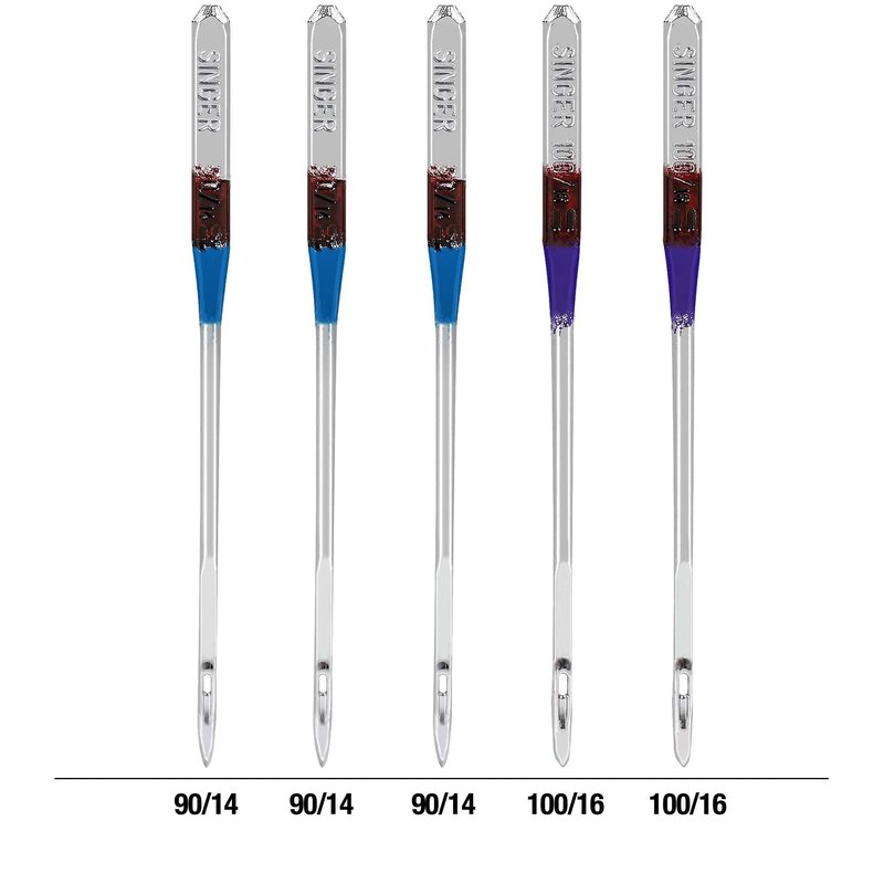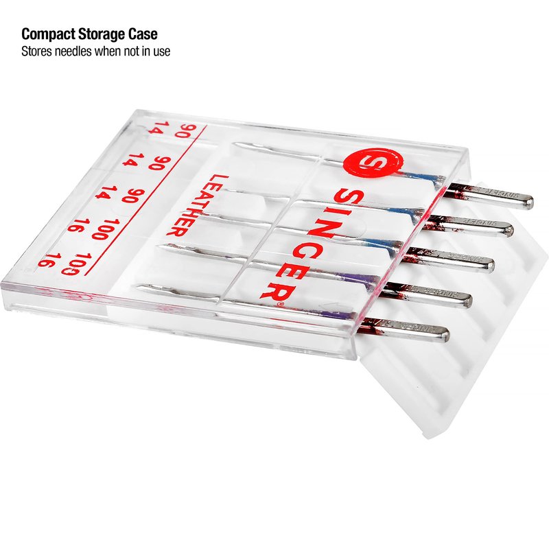 - Set of 5 leather sewing machine needles include three 90/14 sized needles, and two 100/16 sized needles