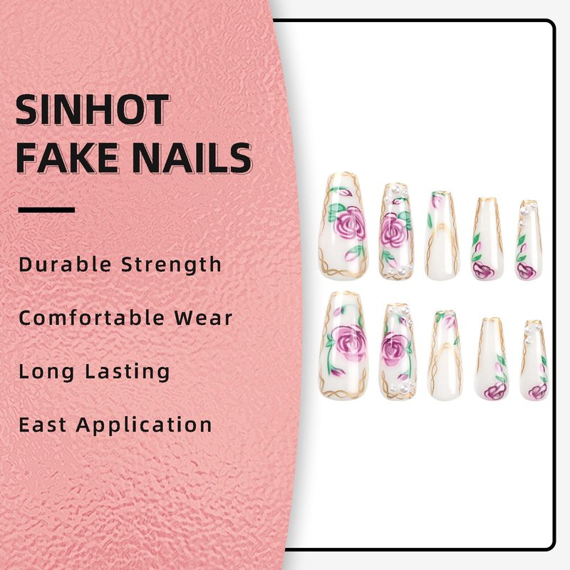SINHOT Square Press on Nails Long Squoval Fake Nails Glossy Glue on Nails Rose Acrylic Nails Gold Line Artificial Nails White Pearls Stick on False Nails with Design 24 pcs