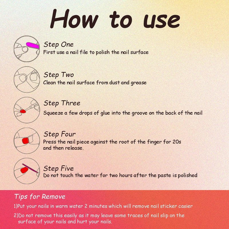- 【Easy to Use】 Clean and polish your nail, select a right size of the nail, apply the glue to the back of the nail then press it on your nail for 20 seconds. Now you have new cute nails!