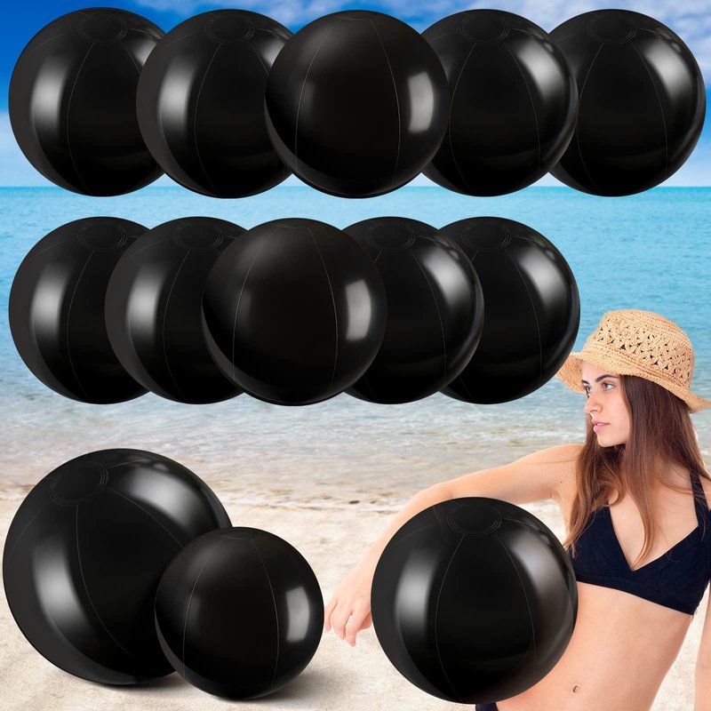 Features: Interesting party and beach supplies: There are 12 pieces of plastic balls, enough for you to use when you want to take a trip to the beach or have a summer themed party at home, these balls will be interesting supplies and bring more joy for your party. Funny presents: The pool balls for swimming pool are practical and creative gifts for family, partners, colleagues and neighbors, you can play games with them, enhancing the relationship between you. Specifications: Material: PVC plastic Color: black Size: approx. 16 inch, 24 inch Package includes: 12 x Solid beach ball Notes: Manual measurement, please allow slight errors on size. The color may exist a slight difference due to different screen displays. Please be careful when inflating, away from pointed objects. Please note that it is normal for beach balls to become smaller in diameter after inflation.