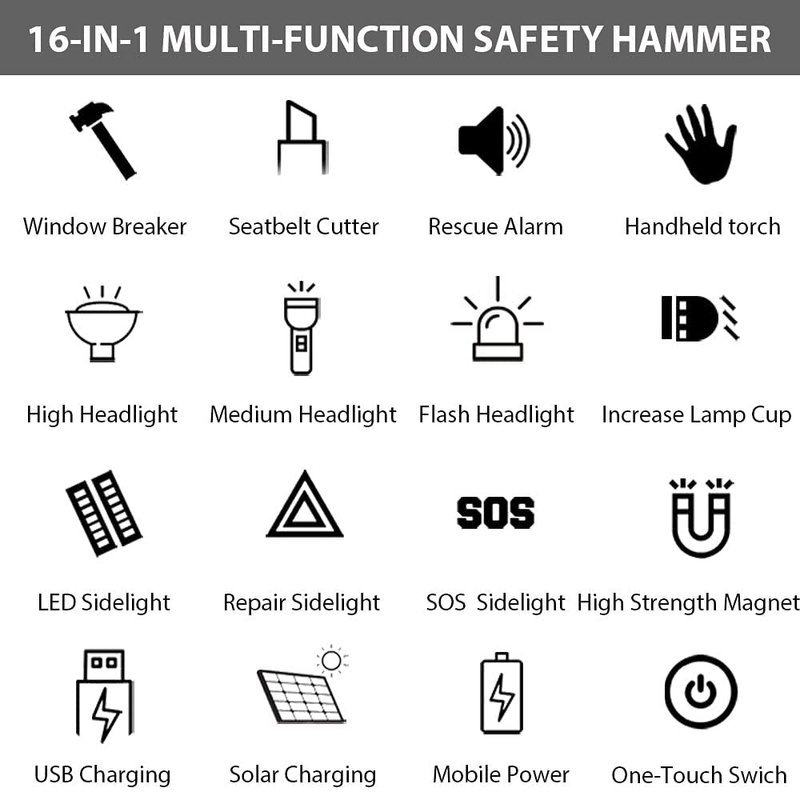 - 16-IN-1 Emergency Kit - Multi-functional kit includes: window breaker, seatbelt cutter, rescue alarm, 3 modes of front light, 2 modes of side light, Strobe SOS Beacon, solar charging, USB charging, mobile power, powerful magnet, enlarged lamp cup, one-button switch, portable design.