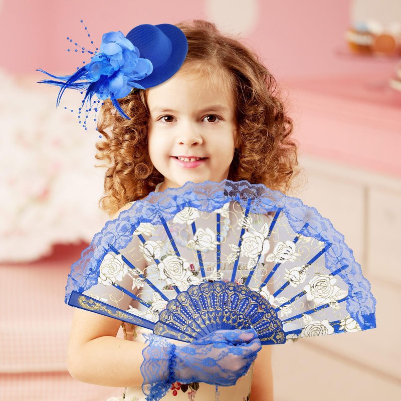 Sintege 4 Pcs Girls Tea Party Supplies Set Tea Party Gloves Hats Girls Tea Party Necklace Fan for Girls Tea Party Favor(Royal Blue)