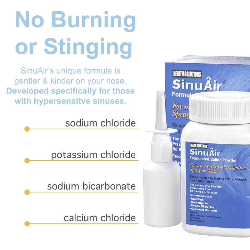 - Safe - Ingredients include SinuAir Formulated Saline Powder, Sodium Chloride, Sodium Bicarbonate, Potassium Chloride, Calcium Chloride - FDA Registered, UL, and CE Approved