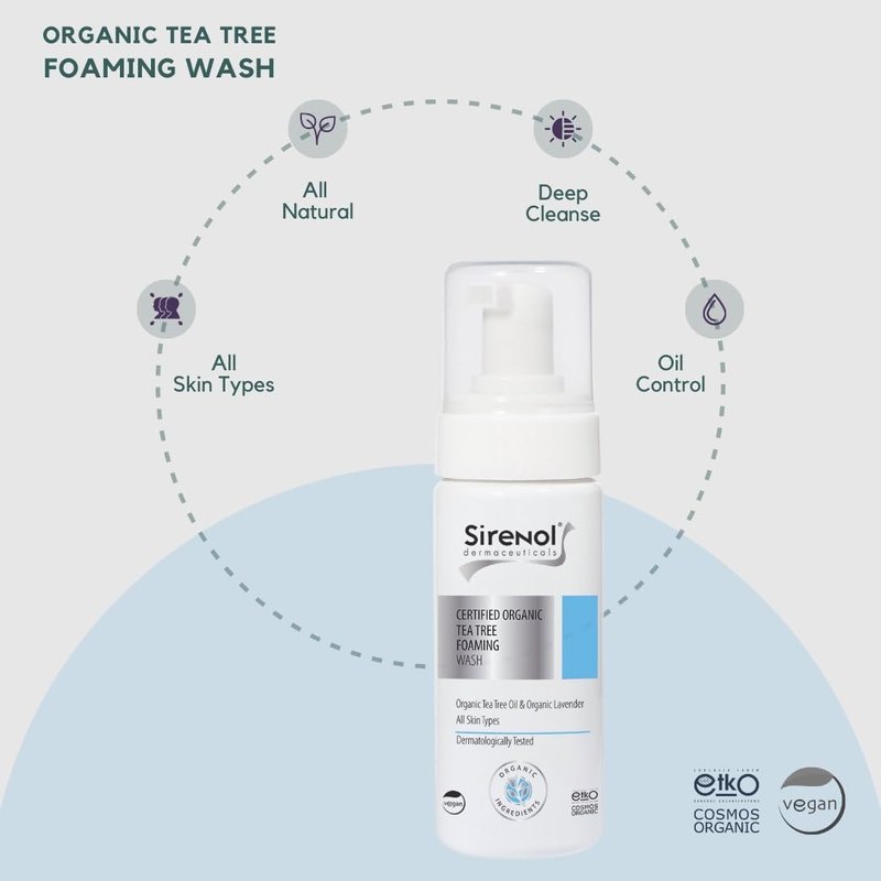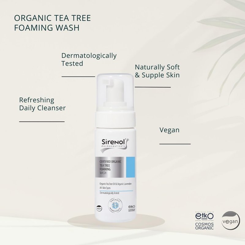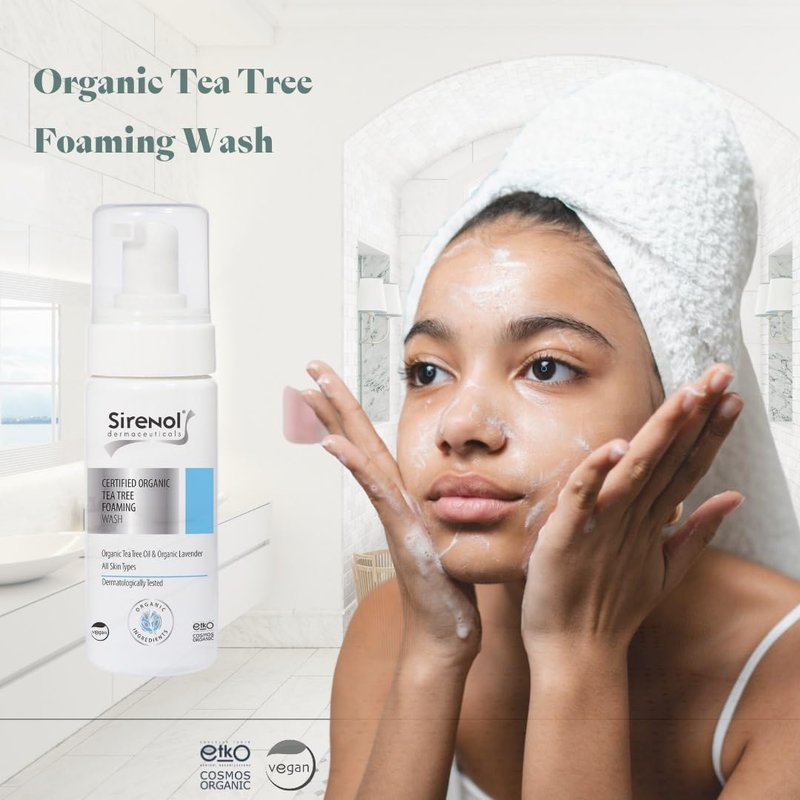 Sirenol Organic Tea Tree Foaming Wash, COSMOS Organic Certified Ingredients, Gentle Cleanser for Clear Skin, 8.45 oz