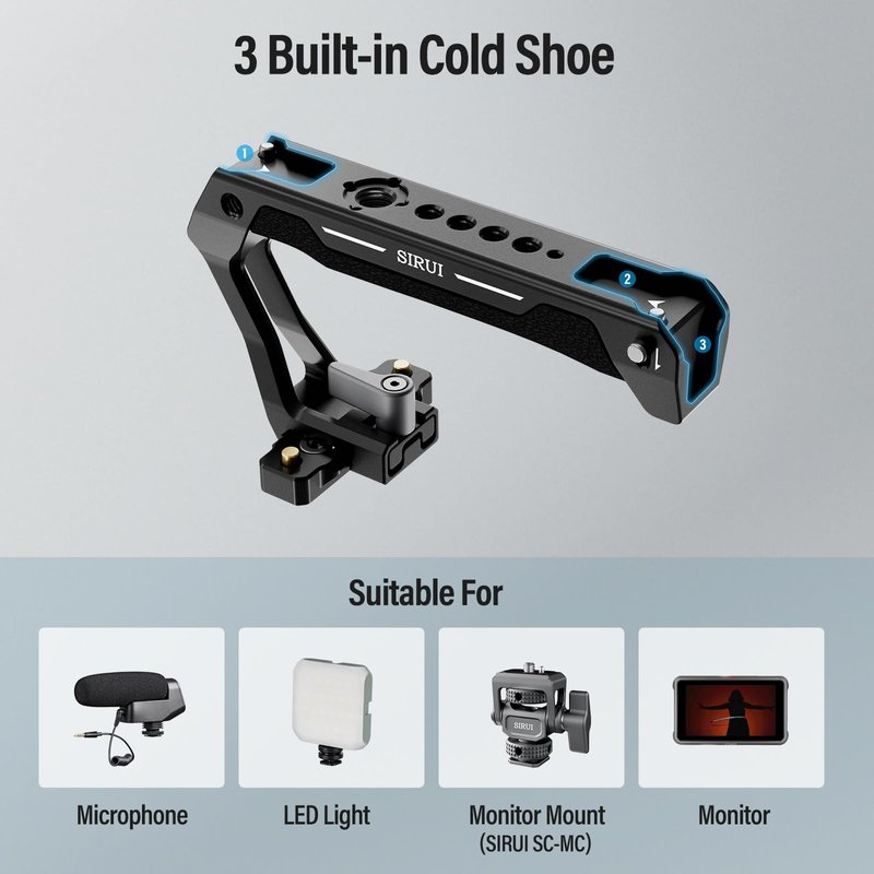 The SIRUI SC-TH NATO top handle, with its lightweight yet robust aluminum alloy construction and ergonomic silicone grip, offers both strength and comfort for photographers and videographers alike. Its tool-free assembly and disassembly through the NATO rail make it exceptionally convenient for rapid setup and low-angle shooting.
