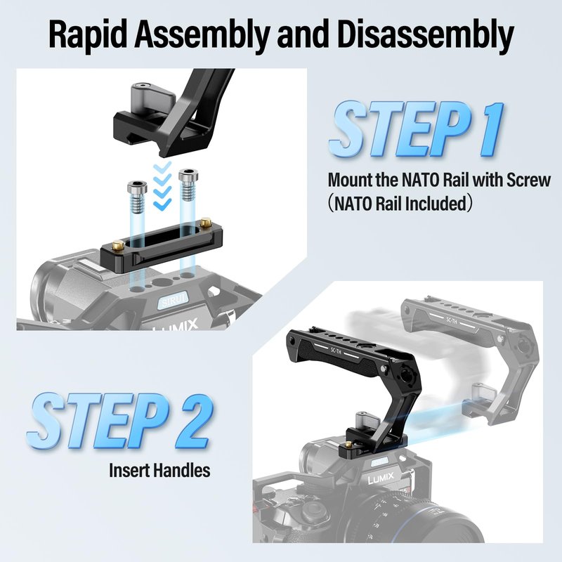 - Swift Assembly and Disassembly: The NATO top handle kit makes the process incredibly convenient. Simply attach the NATO rail to the camera cage, install it into place through the NATO slot, and secure it tightly by using the knob without any additional tools. Note: NATO Rail Included.