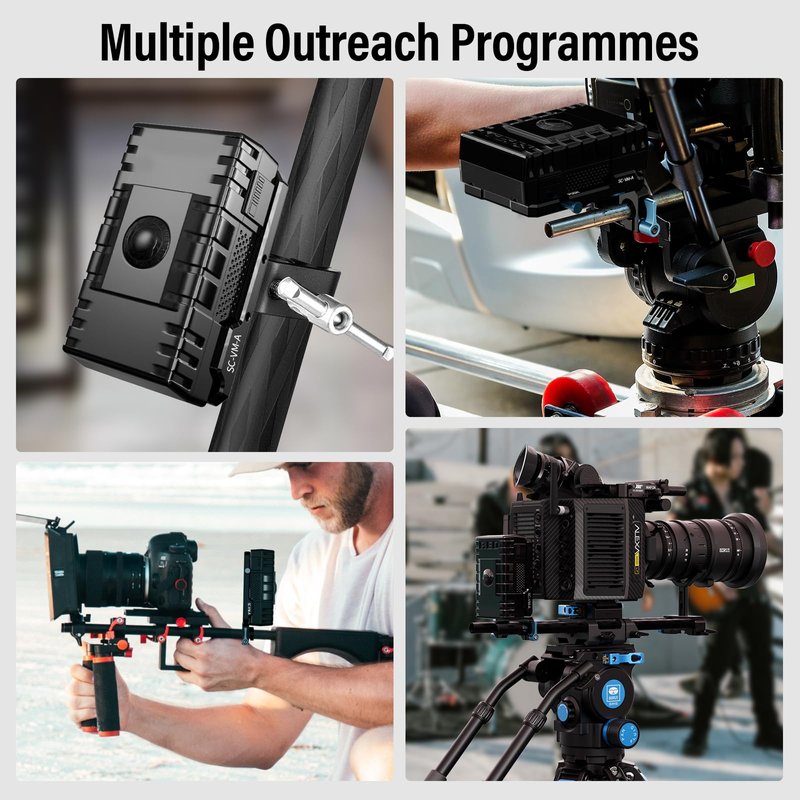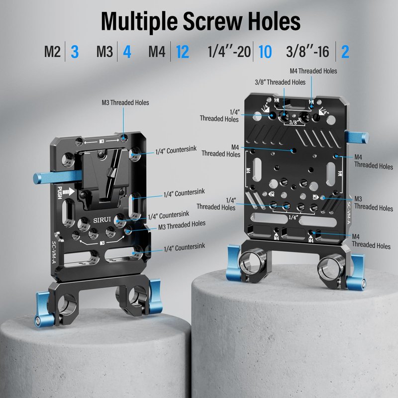 Multiple Mounting Options: The battery plate itself features a variety of threaded holes, accommodating additional accessories like dual-rod clamps, magic arms, or other components, allowing for a highly customizable camera rig setup.
