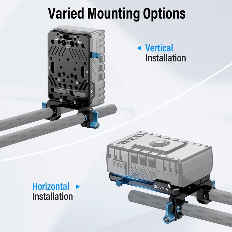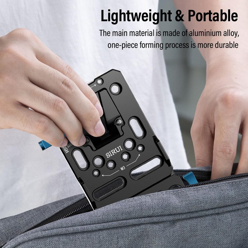 - V-Mount Battery Plate: The SIRUI V-mount battery plate with dual 15mm rod clamp SC-VM-A features a standard V-Mount interface, compatible with most V-Mount batteries. It extends the battery life of your camera equipment by seamlessly connecting to the power port of the battery, ensuring prolonged shooting sessions with uninterrupted power supply.