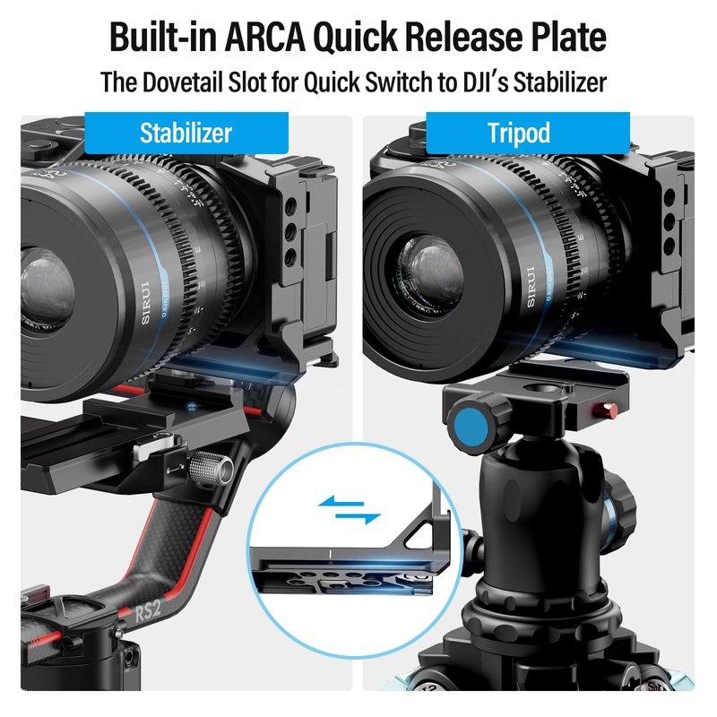 - Built-in Arca-type Quick Release Plate: The bottom of the ZV-E10 camera cage features an Built-in Arca-Swiss quick release plate, which can be directly mounted onto Arca-Swiss type tripods, enabling seamless transitions between handheld, tripod and stabilizer shooting.