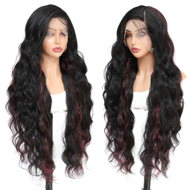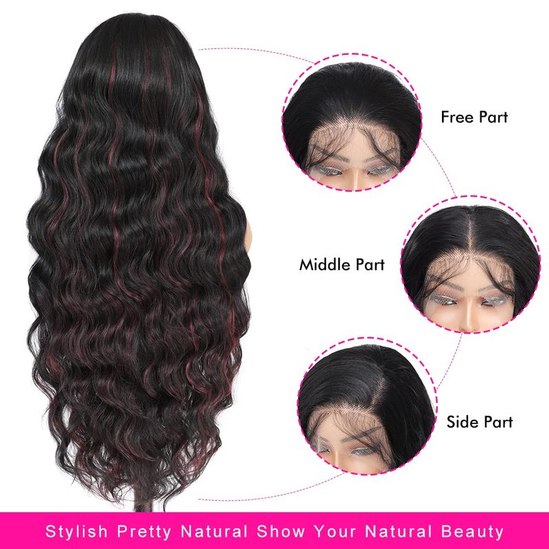 SISgrace 13x4 Lace Front Wigs for Black Women Wavy Wig Glueless Lace Wig Black to Burgundy Highlight Synthetic Wigs Pre Plucked Natural Hairline Mixed Red (Highlight Lace Front Wig 32 Inches)