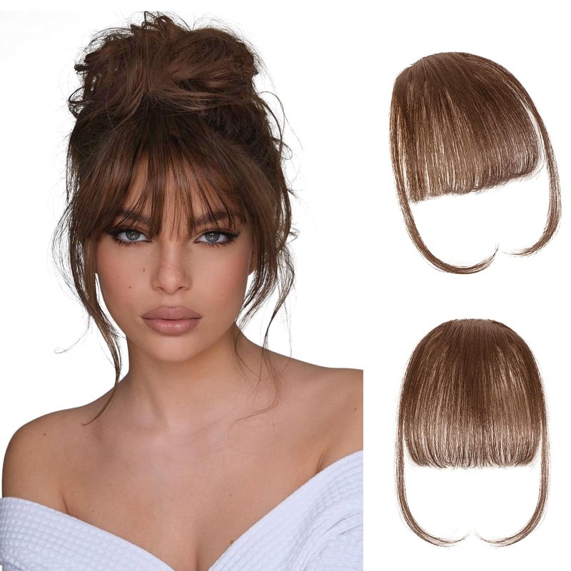 SISLAF Clip in Bangs-100% Real Human Hair Bangs Hair Clip Wispy Bangs Clip On Bangs for Women with Temples Hairpieces Wig Curved Bangs with Hair Roller (Medium Brown)