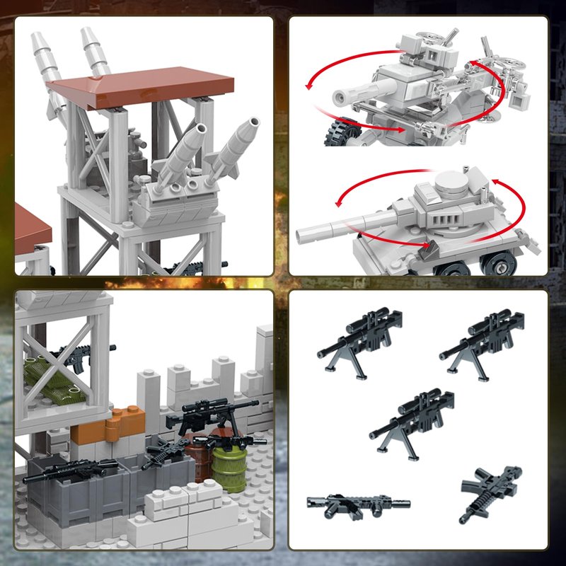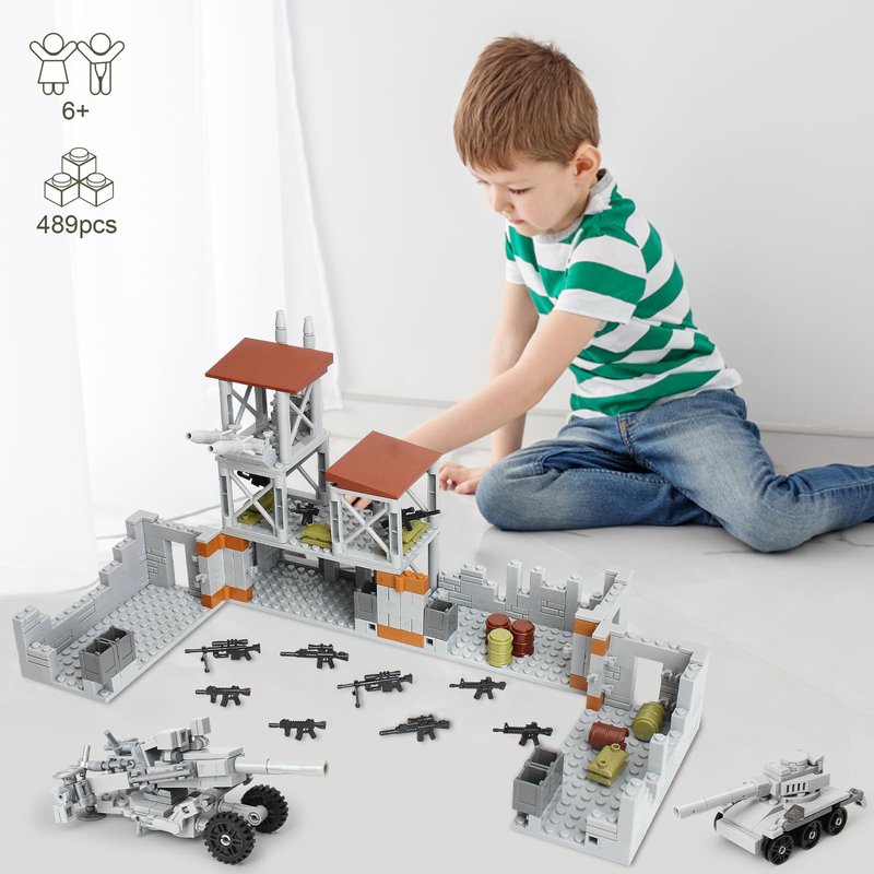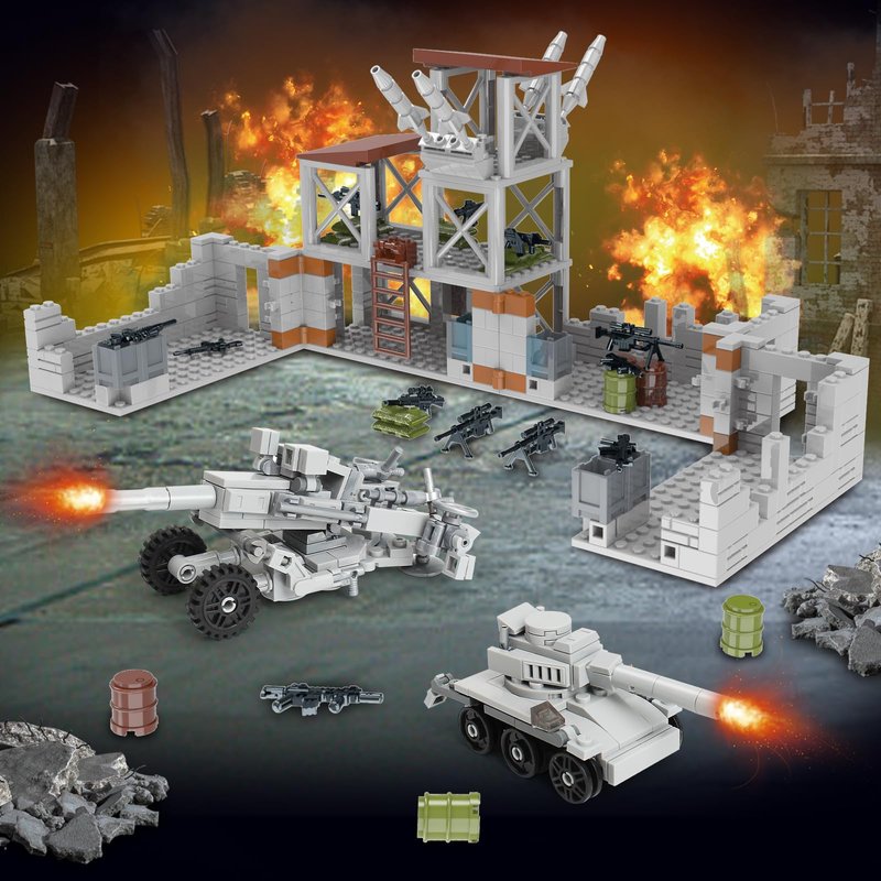 - Rich Accessories & Scenes- This army defence base building set contains a wealth of military accessories, including two different shapes of tanks, some mini guns, sandbags, oil drums. The configuration of guard towers, cannons, etc. also adds more playability to the set. After building, kids can play military games with their friends