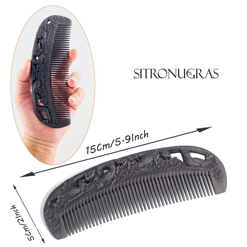 Sitronugras Ebony Wood Comb - Carved Craft Natural Black Sandalwood Hair Comb for Women - No Static Fine Tooth Comb with gift box (Birds and flowers)