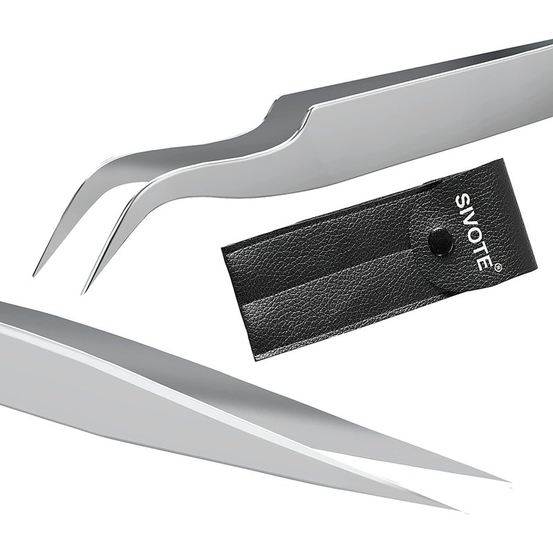 SIVOTE Eyelash Tweezers, 2-Pack, Hand Calibrated Straight and Curved Tips, Stainless Steel Lash Tweezers for Eyelash Extensions, Matte Silver