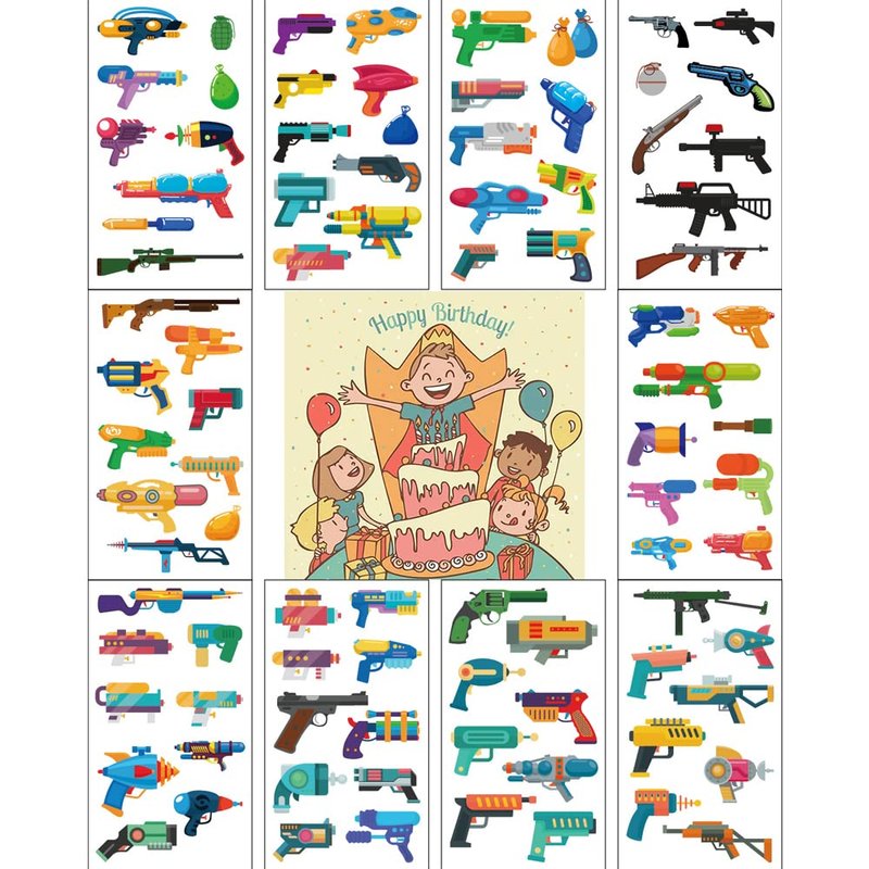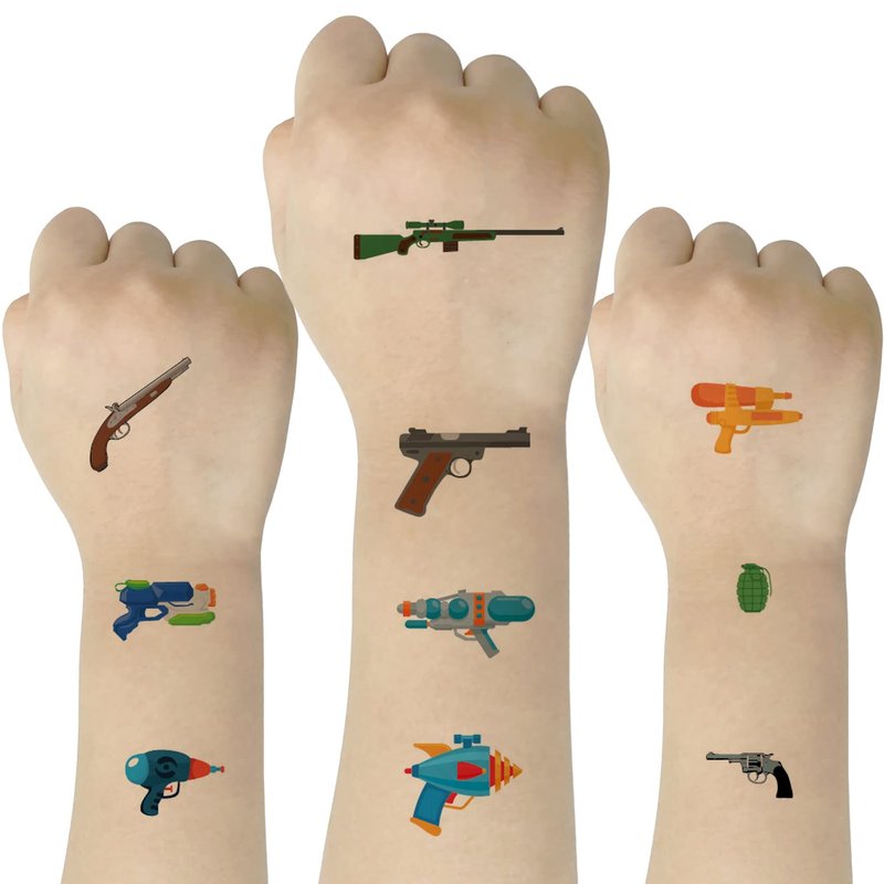 - 【10 different sheets】The package includes 10 different sheets of Gun Tattoo Stickers for kids, boys and girls.