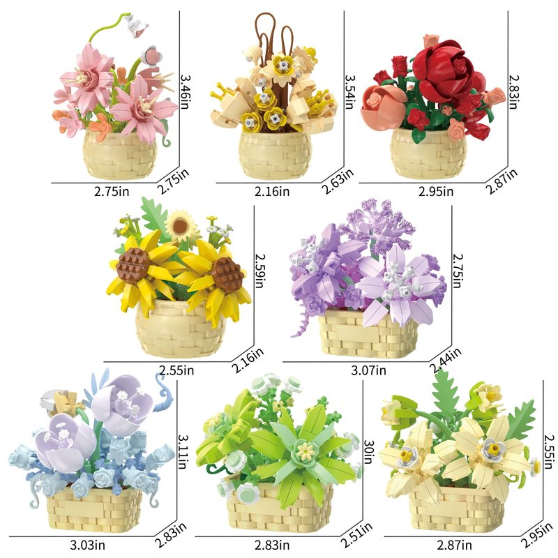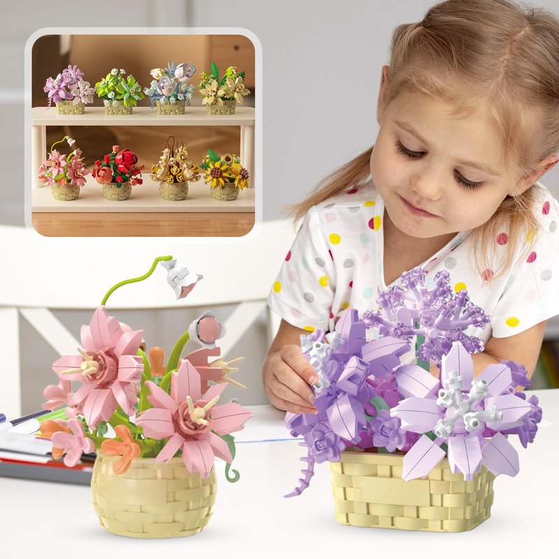 - FLOWER BLOCKS TOYS: There are 8 potted plants including roses, sunflowers, lilies, violets, daffodils, jasper, gardenia.