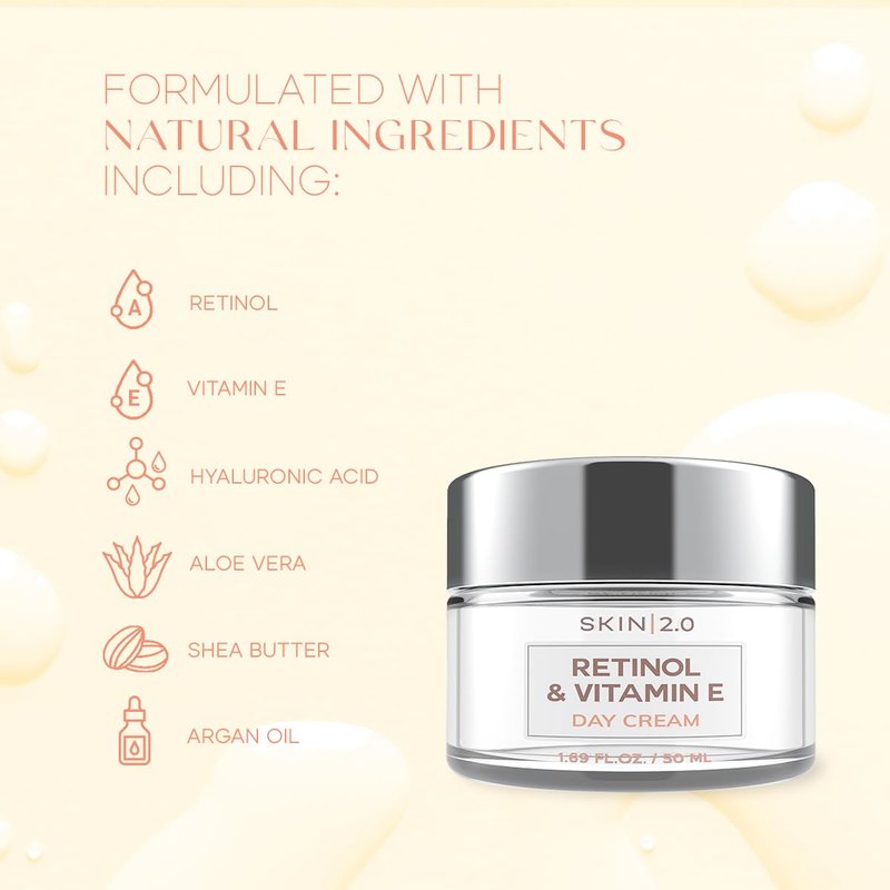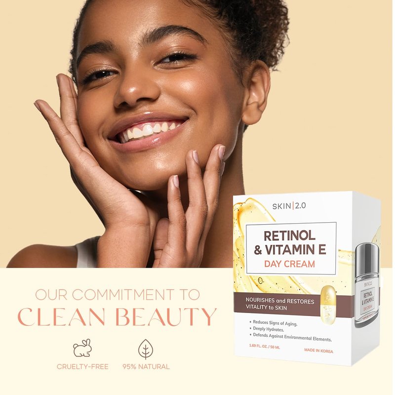 Skin 2.0 Retinol and Vitamin E Daily Face Moisturizer - Reduce Acne Scars, Hydrating, Restore Sun Damaged Skin, Anti-aging Vitamin E Cream - Cruelty Free Korean Skin Care - All Skin Types - 1.69 Fl oz