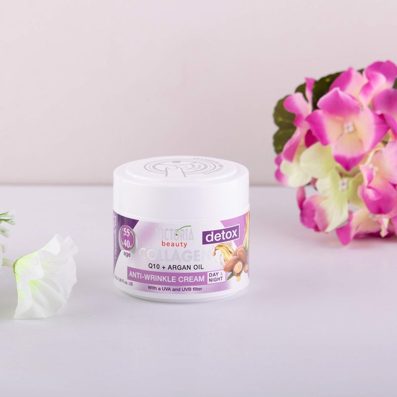 Victoria Beauty Day and Night Anti-Aging Moisturiser with Collagen, Hyaluronic Acid, Q10, Argan Oil, and a UVA/UVB Filter for Ages 40 - 55, 50 ml A multi-purpose cosmetic product, meticulously formulated to provide wholesome skin care for the skin aged 40 - 55. Enriched with collagen and Q10, the product delivers powerful rejuvenating benefits, visibly improving the texture of the skin. The formula with a beauty restoring antioxidant combination (vitamins A, B5 and E), hyaluronic acid, and argan oil deeply nourishes, protects, and revitalizes the skin. Contains а UVA and UVB filter. Contains Benzophenone-3.