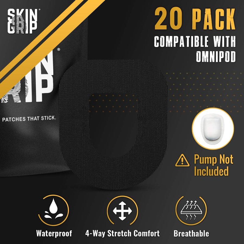 Skin Grip CGM Patches for Insulet Omnipod (20-Pack), Waterproof & Sweatproof for 10-14 Days, Pre-Cut Adhesive Tape, Continuous Glucose Monitor Protection(Black)
