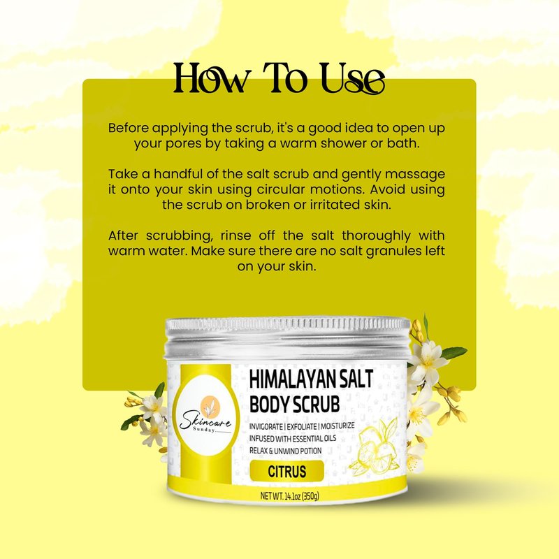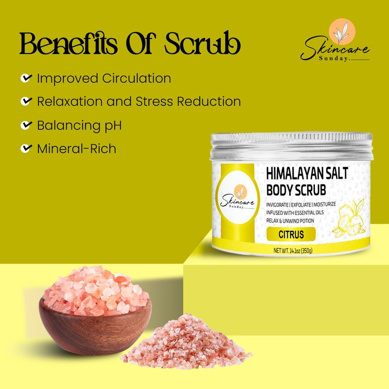 - Benefits of Citrus in Scrub: A Himalayan salt body scrub with a citrus scent offers a refreshing and invigorating experience, combining the benefits of exfoliation with the uplifting aroma of citrus. Citrus scents, such as lemon, orange, or grapefruit, are known for their invigorating and mood-boosting properties.
