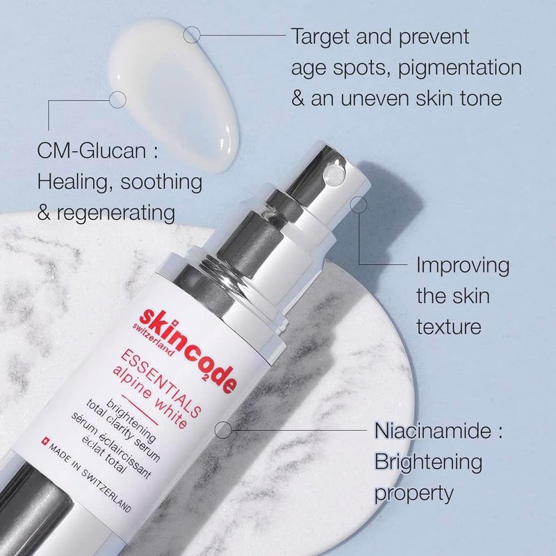 This lightweight, hydrating serum is a multi-tasking treatment designed to target and prevent age spots, pigmentation and an uneven skin tone. It is formulated with the healing, soothing and regenerating properties of CM-Glucan, in addition to brightening Niacinamide, also known as Vitamin B3, and an Alpine Plant Derived Complex to treat problem areas showing signs of pigmentation and other imperfections. When used in addition with the other Skincode Essentials Alpine products, the Brightening Total Clarity Serum can help minimize and prevent the appearance of dark spots.