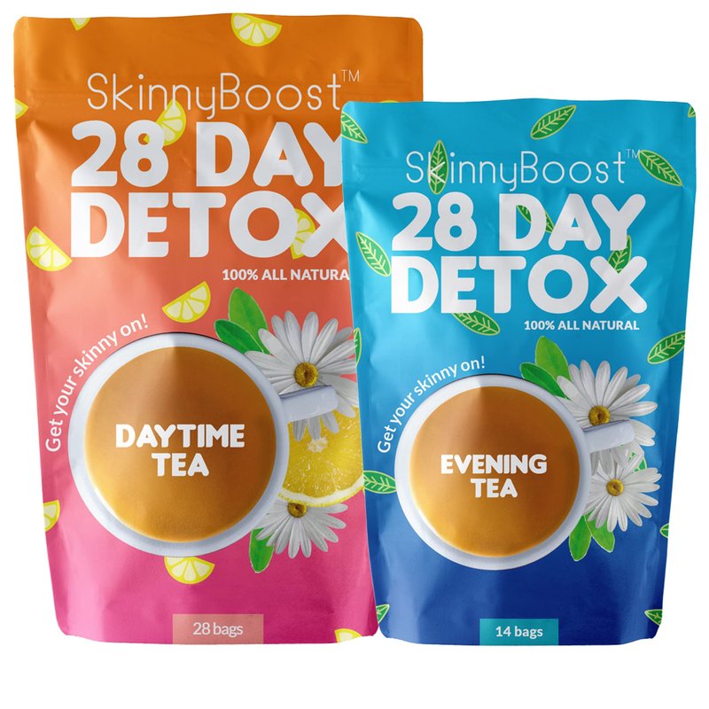 - CLEANSE & DETOX IN 2 STEPS – Skinny Boost 28 Day Detox kit includes 1 Daytime Tea (28 tea bags) and 1 Evening Tea (14 tea bags) The Skinny Boost 2 step detox plan is all natural and made of green and oolong teas and herbs. The combination of our powerful all natural ingredients are the perfect way to support a detox cleanse for weight loss and belly fat reduction.