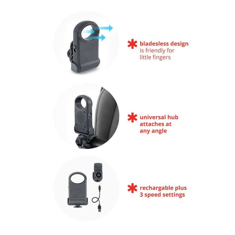 - Designed to securely attach to strollers with the included universal hub, our bladeless stroller fan is friendly for little fingers and easily adjusts to multiple angles
