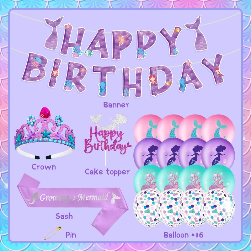 - Mermaid Birthday Decorations for Girls: The box includes: 20*12 inch colorful mermaid latex balloons, 1x purple mermaid 'Happy Birthday' Banner (6*80 inch), 1 purple DIY mermaid crown, 1 mermaid cake topper, 1 purple mermaid sash with sliver letter 'Growing a Mermaid'