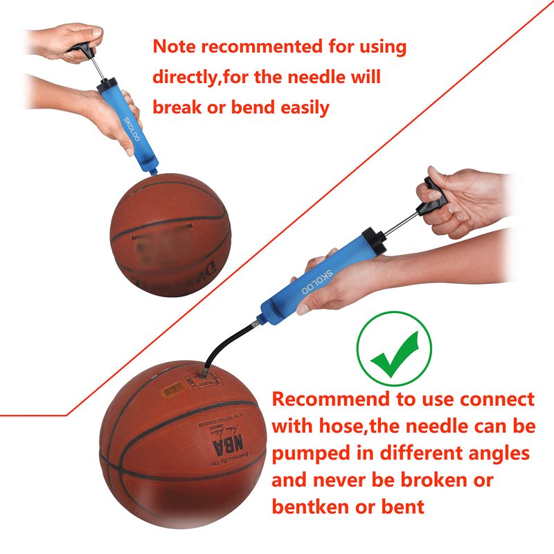 - [ PRACTICAL AND GUARANTEED ACCESSORIES ]: Comes with metal pin needles/ removable and flexible rubber hose/ plastic tapered nozzle. Highly recommend you to use the flexible rubber hose and a pin needles to pump up any sport balls, Soccer Basketball Football Volleyball Water Polo ball Rugby Netball Gym Ball Yoga ball, you can inflate them in different angles and thus prevent your ball needle broken into the ball because of the improper operation.