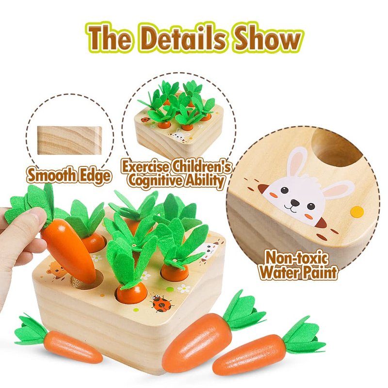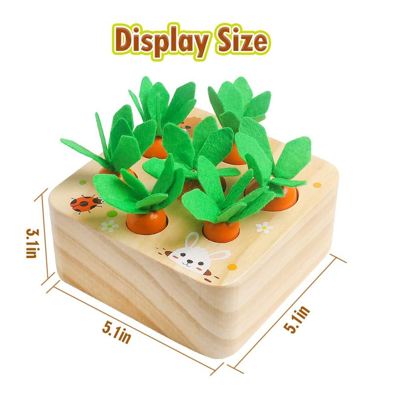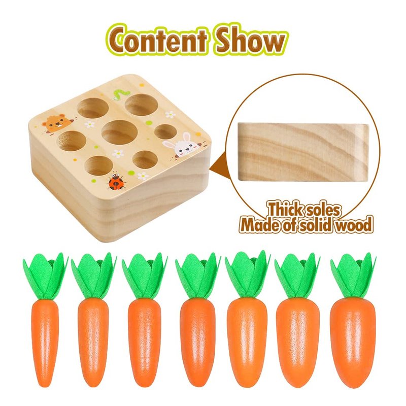 • Wooden Carrot Harvest Game: Wooden carrot sorting toy has 7 different sizes of wooden carrots match with different holes, help your toddler to built their intelligence and size while pulling out and putting back into the matching holes to complete the planting. Helps improve fine motor skills and hand-eye coordination.
