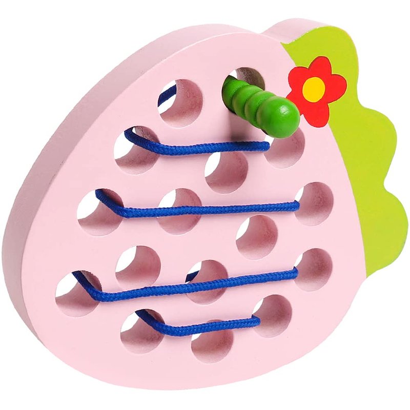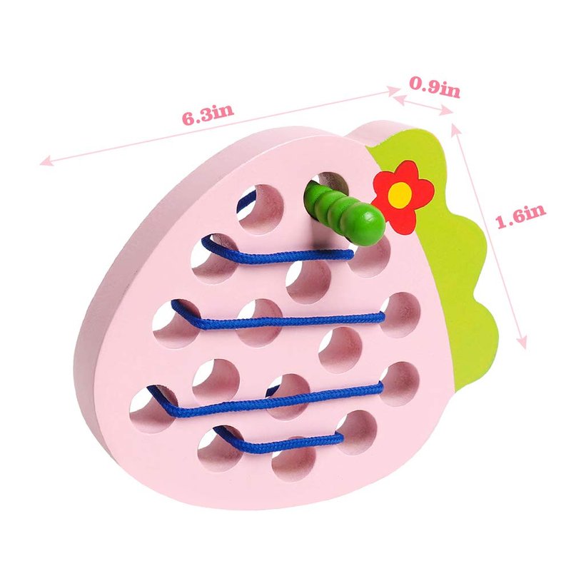 - FUN AND CREATIVE: The Wooden Lacing Strawberry Toy is a simple, vivid pink Strawberry with smooth holes and green leaf look so much delicious, let the hungry caterpillar eat it sooner. Help the string-attached caterpillar munches through the Strawberry by threading in and out. Perfect for training and developing personal skills.