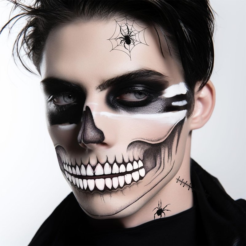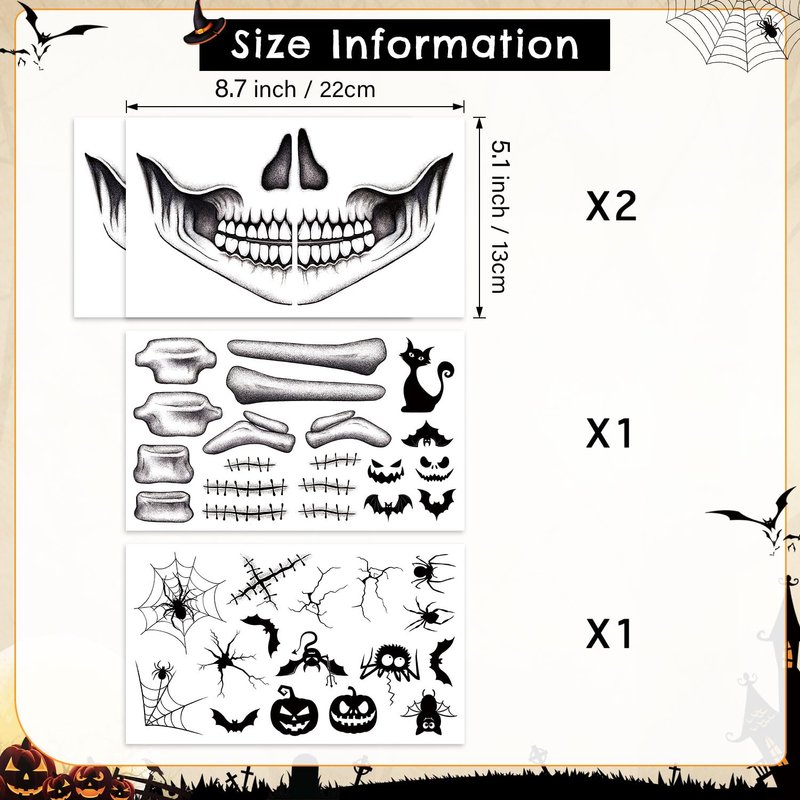 - Spooky Design: This temporary face tattoo set features an intricate skull design with creepy details like cracks, stitches, and spiders for a frightening Halloween look. The set also includes a variety of intricate designs featuring pumpkins, spiderwebs, bats, and other eerie elements to mix and match.