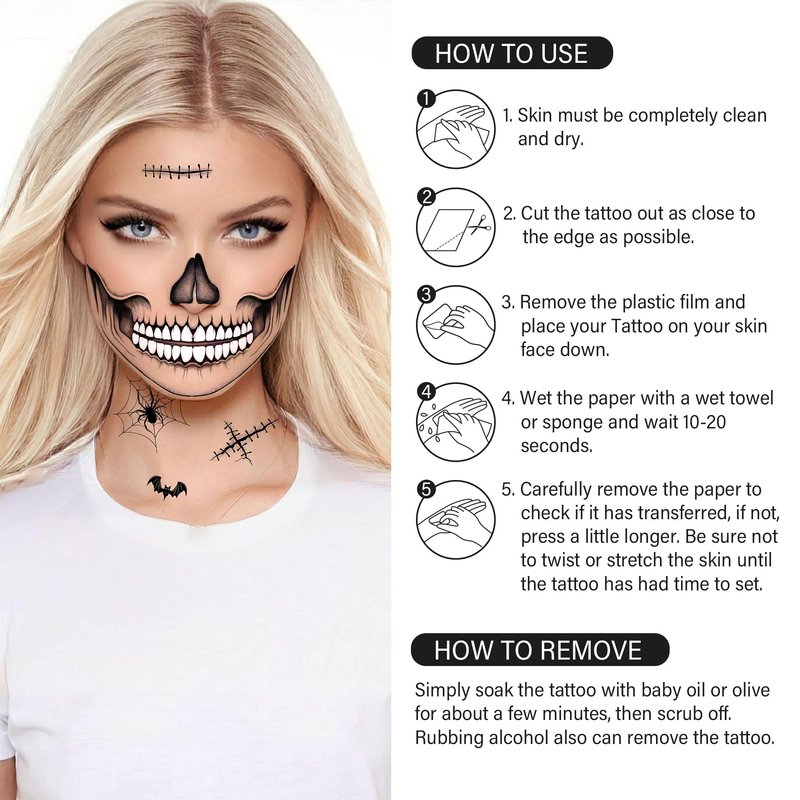 - Suitable for All Ages: These tattoos are safe for both kids and adults to wear for Halloween parties, trick-or-treating, or other festive occasions. The skeleton mouth tattoo is designed for adults (men and women), these tattoos offer an edgy and haunting look that's perfect for Halloween parties or costume events.