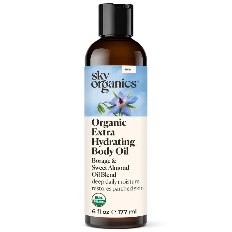 Sky Organics Organic Extra Hydrating Body Oil Experience the luxurious benefits of Sky Organics Extra Hydrating Body Oil, a hydrating oil simply crafted with a blend of just five pure and potent organic ingredients. Say goodbye to dryness and hello to more radiant, nourished skin. Pure, Organic Skin-Loving Oils Potent organic borage oil deeply moisturizes, leaving your skin feeling revitalized and rejuvenated. Unrefined and cold-pressed, Organic Sweet Almond oil helps nourish and hydrate skin. Replenishing Organic Acai oil, a powerhouse of essential fatty acids, helps promote a smooth and supple appearance, giving your skin a more youthful and radiant glow. Complete your Spa Ritual at Home After bathing, indulge you skin in the fusion of these pure and potent oils that will leave your body feeling pampered and revitalized. This simple organic oil blend is the ideal choice for massage on damp or dry skin, helping to keep skin supple, radiant and beautifully moisturized. As a Certified B Corporation, we pledge to meet rigorous standards of social and environmental responsibility. With our USDA Certified Organic and Leaping Bunny Certified Cruelty-Free formulations, you can indulge in pure, sustainable care that's good for you and the planet.